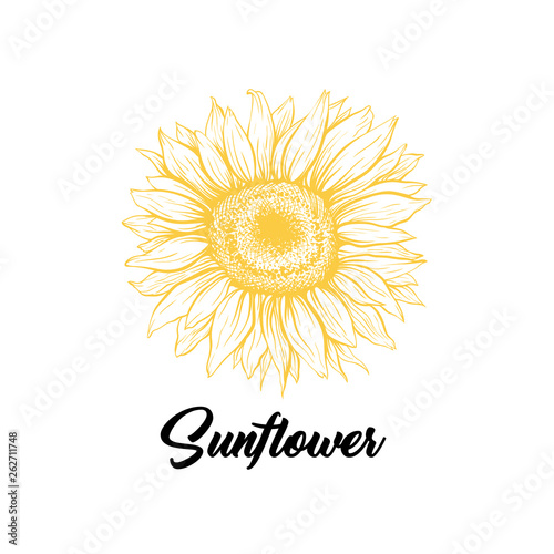 Sunflower Yellow Blooming Sketch Illustration Summer Flower With Black Calligraphy Helianthus Outline Logo Drawing Floral Botanical Isolated Clipart Eco Farming Logotype Design Vector Idea Stock Vector Adobe Stock