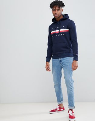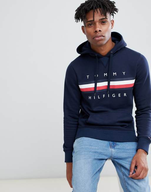 Tommy Hilfiger Icon Stripe Logo Print Hoodie In Navy Asos